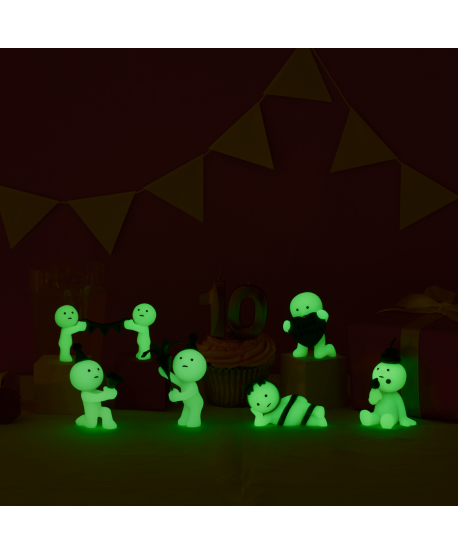 Smiski’s zijn gemaakt van fosforescerend materiaal dat licht absorbeert en het figuurtje doet oplichten in het donker. Ze worden verkocht in een “blind box”: het figuurtje zit willekeurig verpakt in een blind, gesloten doosje. Je weet dus nooit op voorhand welk figuurtje je uit de serie krijgt.